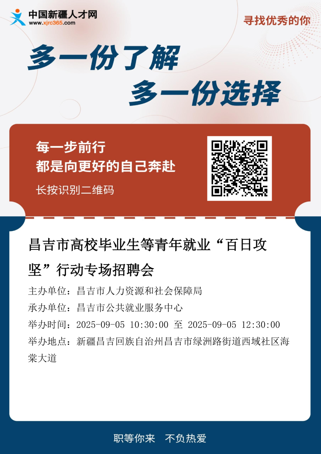 职引未来 筑梦青春 2025年9月5日上午10:30-12:30 昌吉市绿洲路街道西域社区海棠景观大道党建商业联盟服务驿站(文化东路与海棠大道交汇处西北角) 主办单位:昌吉市人力资源和社会保障局 承办单位:昌吉市公共就业服务中心 协办单位:绿洲路街道办事处 一、重点面向2025届高校毕业生及往届未就业高校毕业生等青年,同时兼顾农民工、城镇失业人员等有就业意愿的各类求职人员。 二、有用工需求的各类用人单位。 一、手机端报名:用工企业长按下面二维码进行扫码报名,求职者长按下面二维码扫码预约报名并于当天按时参加招聘会。 电脑端报名:用工单位登录中国新疆人才网(www.xjrc365.com)现场招聘会专栏在线报名; 二、求职者直接到现场参会; 三、参会企业可携带单位岗位信息展架及宣传资料; 四、相关事宜请拨打咨询电话0994-2342469。
