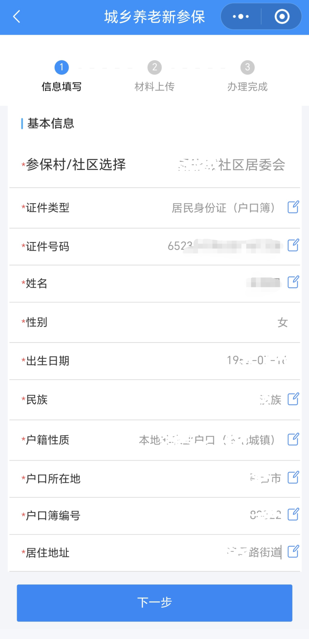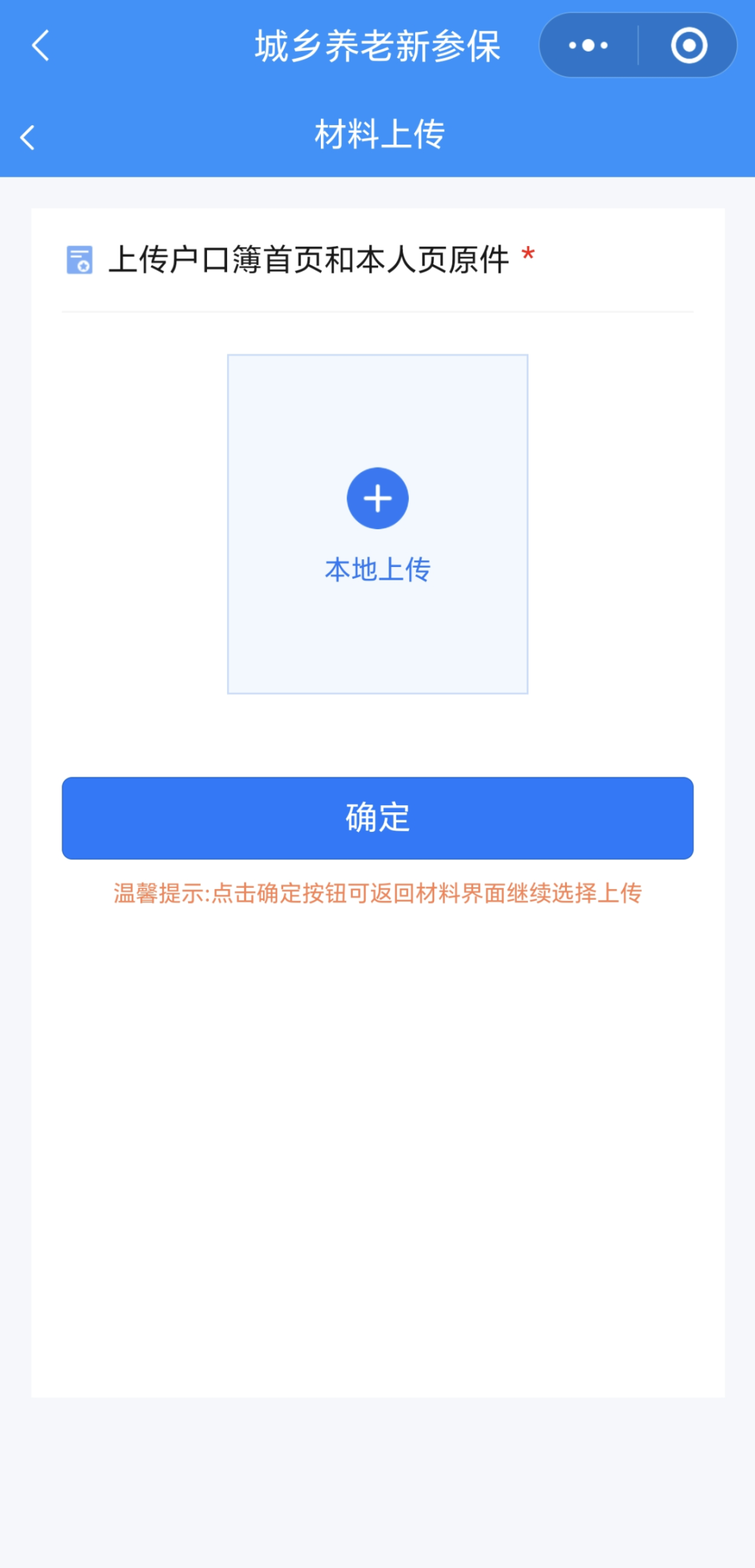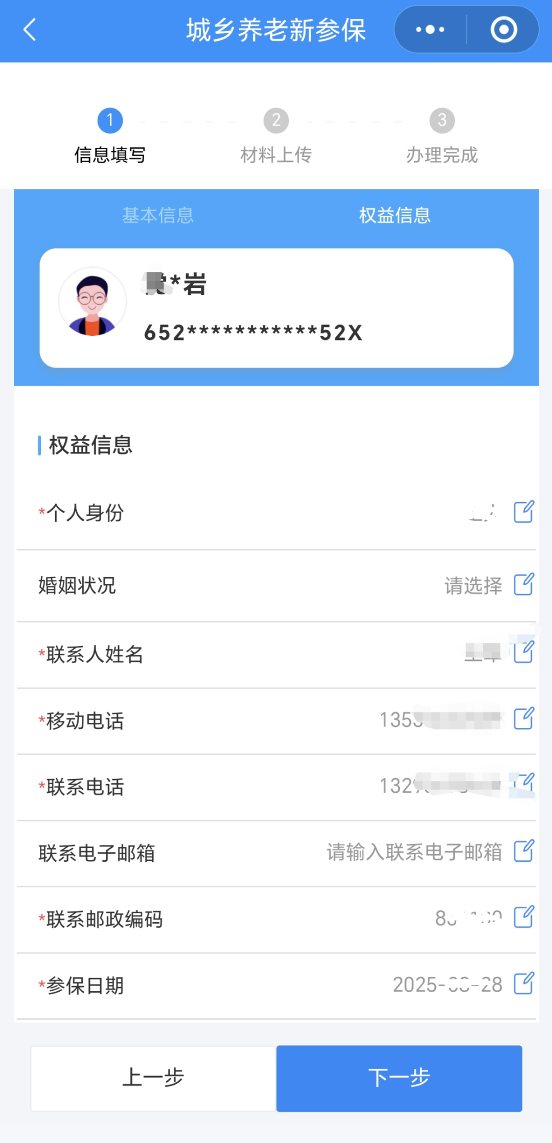 城乡养老新参保申请人,根据系统提示填写对应内容并上传影像,完成后点击“提交”。