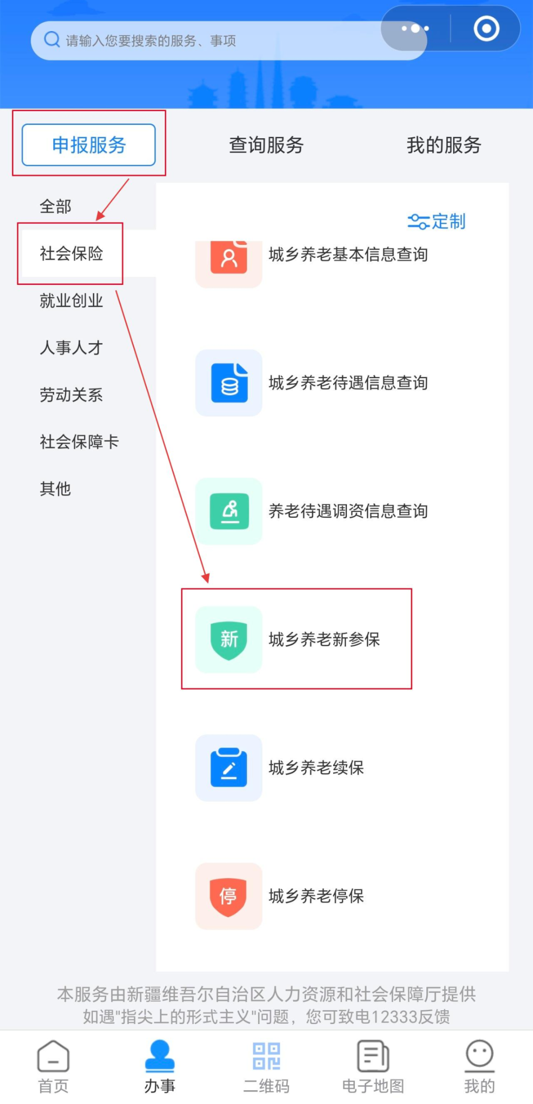进入“申报服务”中“社会保险”模块,点击“城乡养老新参保”。