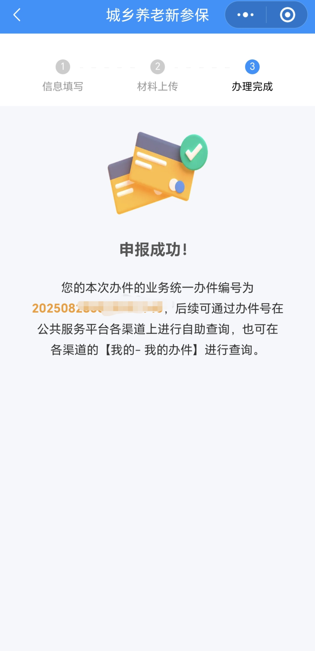 “办理完成 ”模块系统会提示“申报成功”。城乡养老新参保申请人可返回首页,在“我要查”模块,查询该事项办理进度。