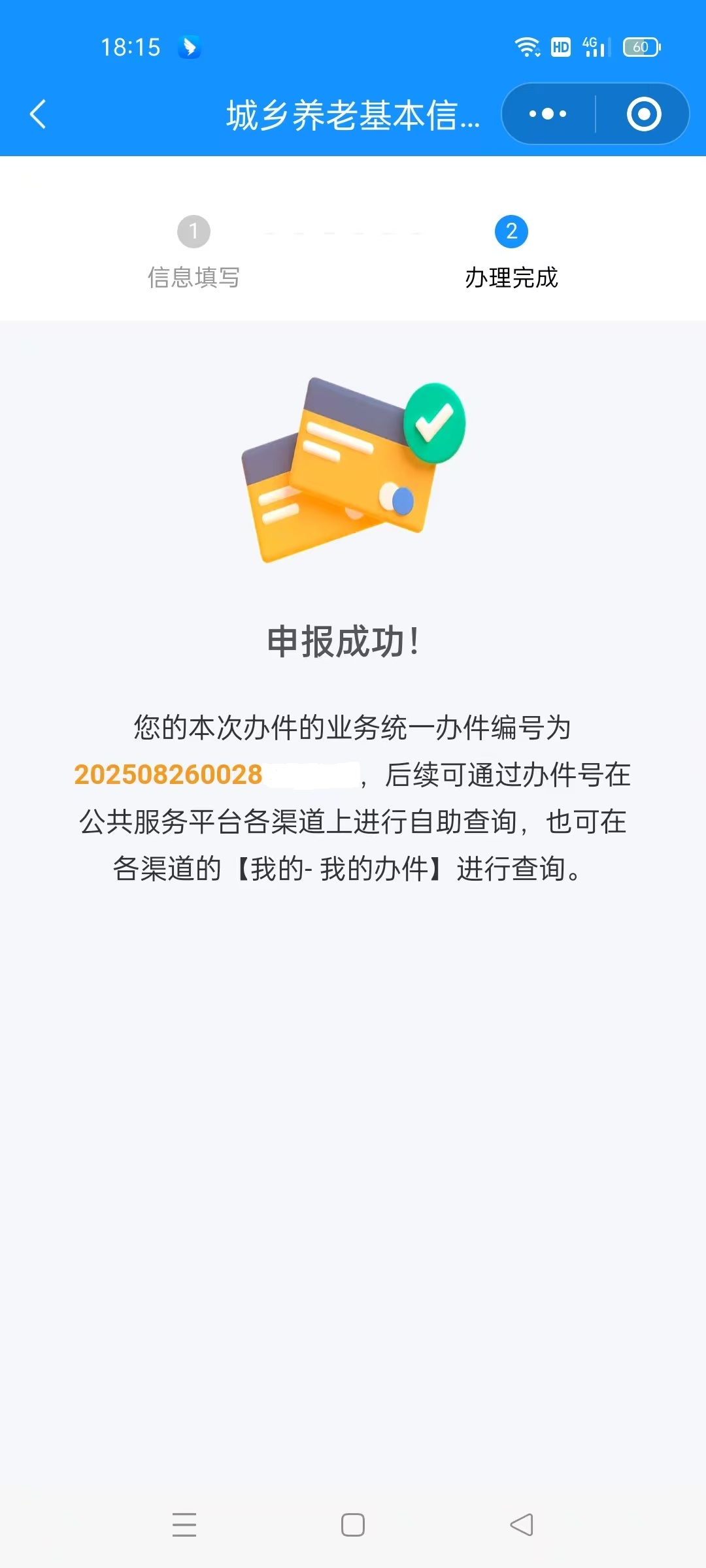 “办理完成 ”模块系统会提示“申报成功”。城乡养老基本信息变更申请人可返回首页,在“我要查”模块,查询该事项办理进度。