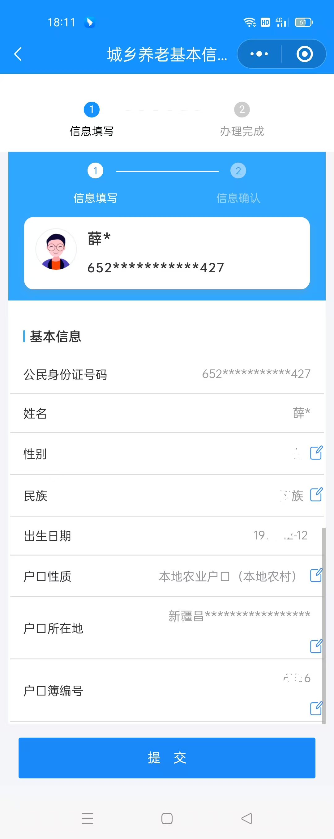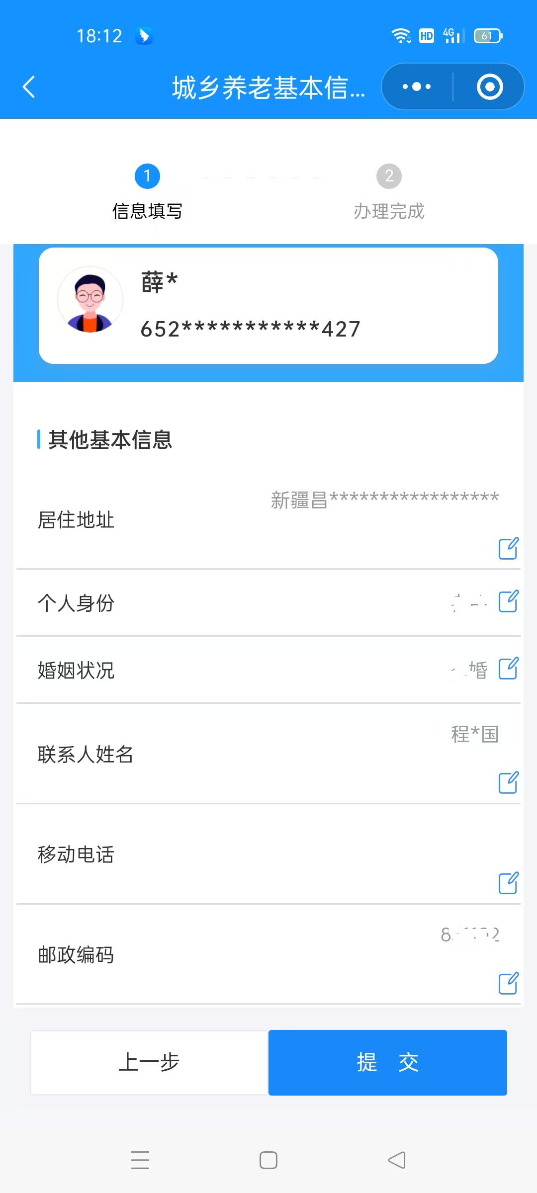 城乡养老基本信息变更申请人,根据所变更内容填写需变更信息,如“联系人姓名”、“联系电话”等相关信息,填写完成后点击“提交”。