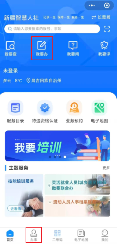 城乡养老基本信息变更申请人注册登录“新疆智慧人社”APP(微信小程序)后,选择参保地“昌吉回族自治州”。