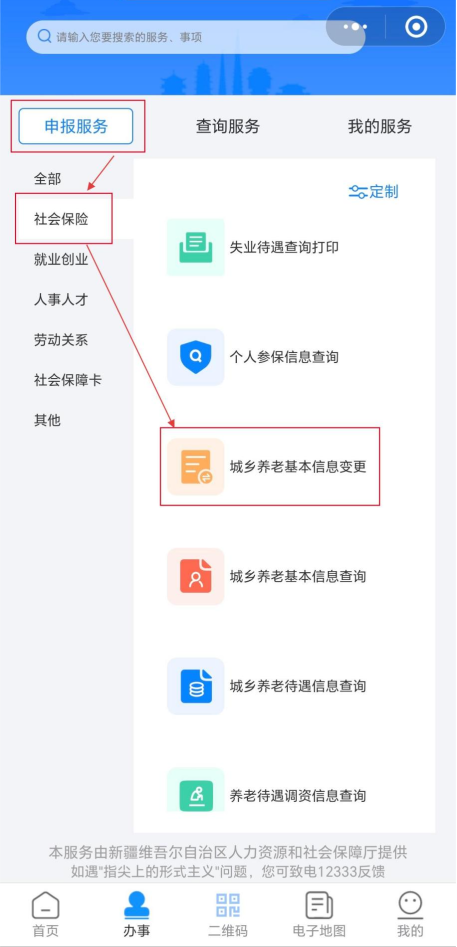 进入“申报服务”中“社会保险”模块,点击“城乡养老基本信息变更”。