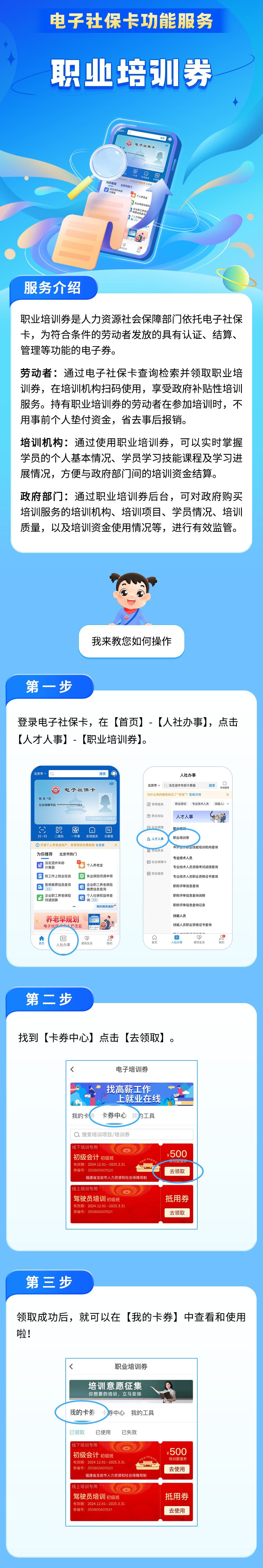 高校毕业生能否申请领取 职业技能评价补贴? 听说参加培训还可以 领职业培训券? 用电子社保卡就可以领哦! 图片来源:社会保障卡微信公众号 如果想参加免费技能培训 各地在官方网站、 政务服务平台等线上平台 设置培训专栏 公开培训信息导航图 为劳动者检索培训信息 自主选择培训 提供查询等便捷服务 劳动者可根据需要自主参训 符合条件人员 按规定享受培训补贴政策