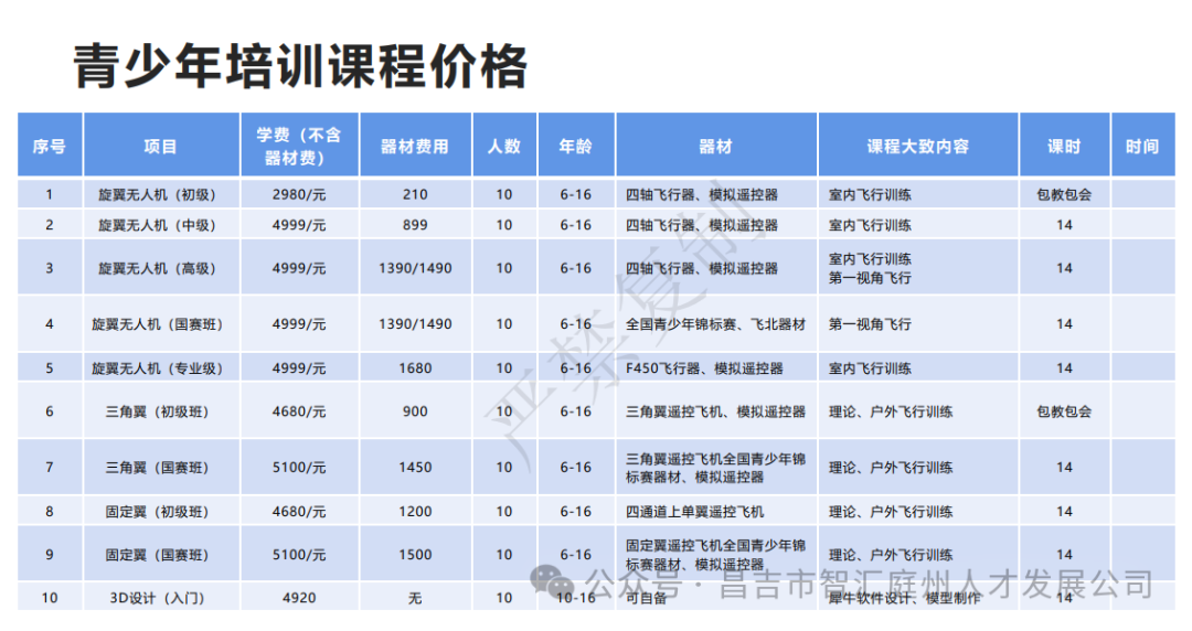 10人小班教学:老师经验丰富,全程关注每个孩子的学习进度,效果有保障; 专业实训场地:新疆开放大学校内无人机实训基地,安全规范、设施齐全;学员满班可放至昌吉人才港集中培训。 学费透明无隐藏:价格从2980元到5100元不等,器材费单独核算,明明白白消费; 实战机会多多:组织科普活动和专业比赛,让孩子学以致用,收获荣誉与成长! 无人机小班教学
