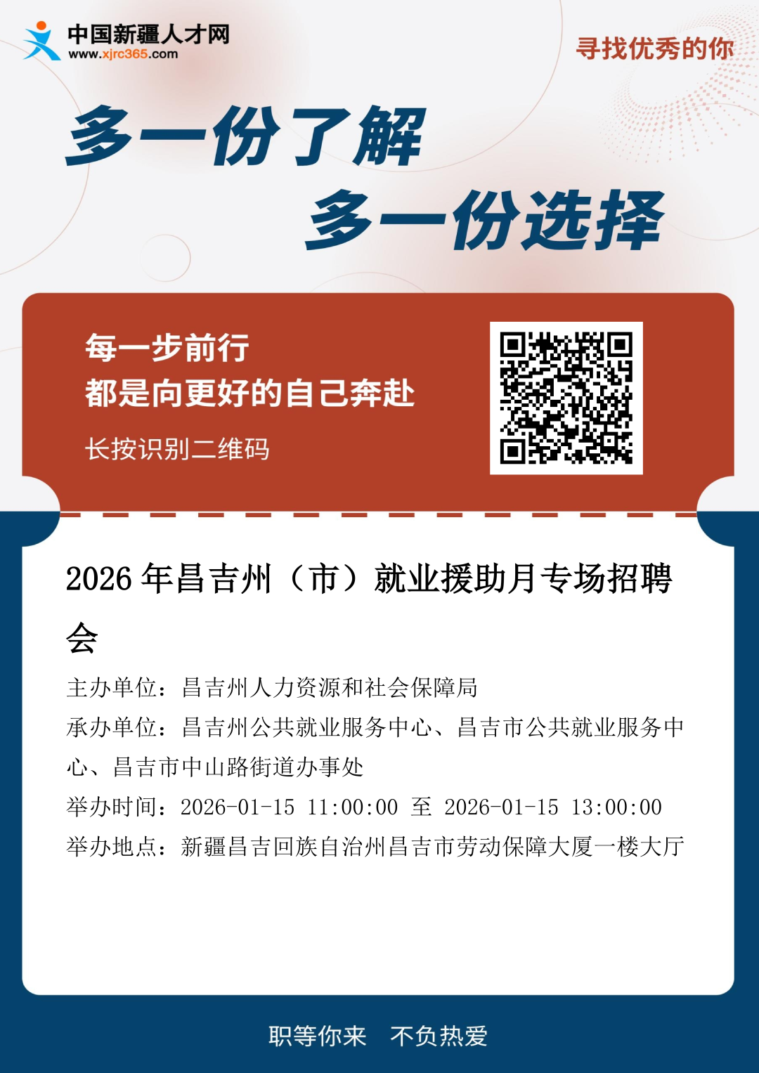 为全面贯彻党的二十大精神,坚决落实区、州党委、政府关于稳就业工作决策部署,全面做好我州助企惠民促进就业工作,根据自治区公共就业服务专项活动安排,昌吉州人力资源和社会保障局拟定召开昌吉州、市2026年就业援助月专场招聘会,现就有关事宜通知如下: