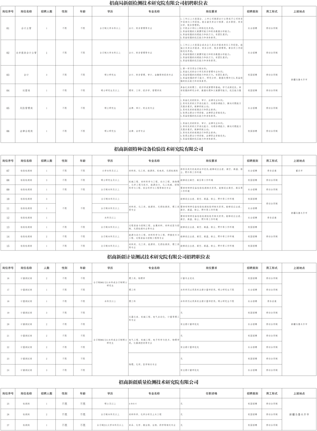 招商局新疆检测技术研究院有限公司(简称“招商新检”)是招商局检测技术控股有限公司控股、自治区市场监督管理局和自治区国资委共同持股的国有全资公司。招商新检由原自治区质检院、计量院、特检院、纤纺中心四家检验检测事业单位转企改制或事企分离组建而成,是全国首个省级NQI(国家质量基础设施)一体化转企改制和央地合作改革的成功范例,主要开展检验检测、计量检定/校准、标准化和质量技术服务、特种设备检验检测、认证认可、大数据/信息化、技术研究及开发、技术培训和人才开发等业务。