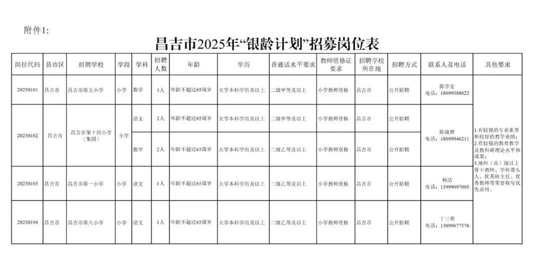 附件:1.昌吉市2025年“银龄计划”招募岗位表